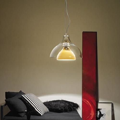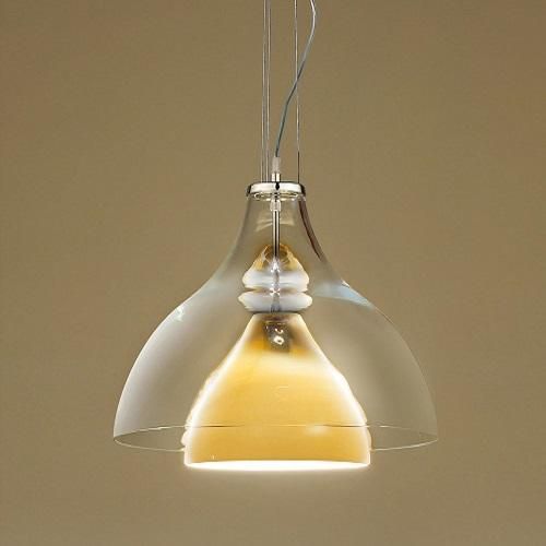 מנורת תליה ALMA עשויה מזכוכית מורנו מנופחת בעבודת יד . מורכבת בשני זכוכיות שקופה וצבע אמבר.